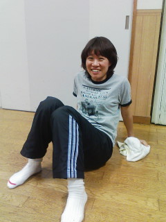 稽古場で、まるで屋外の芝生の上で、お弁当をひろげているかの様な大場氏。